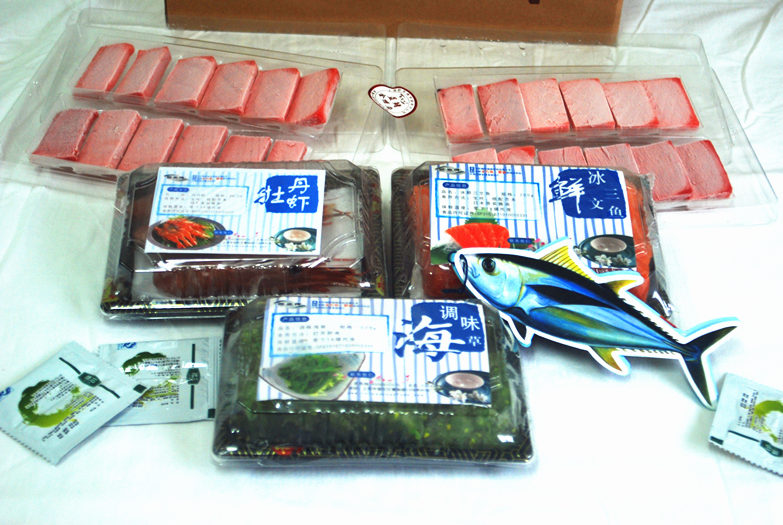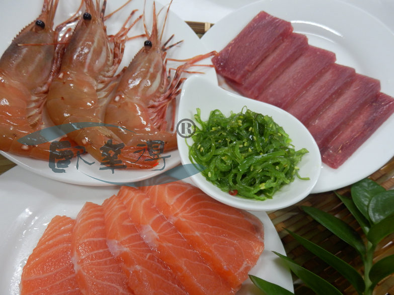 藍鰭金槍魚赤身180G/盒/2盒,冰鮮三文魚200G/盒/2盒,牡丹蝦3只/盒/2盒,送海草250G。
